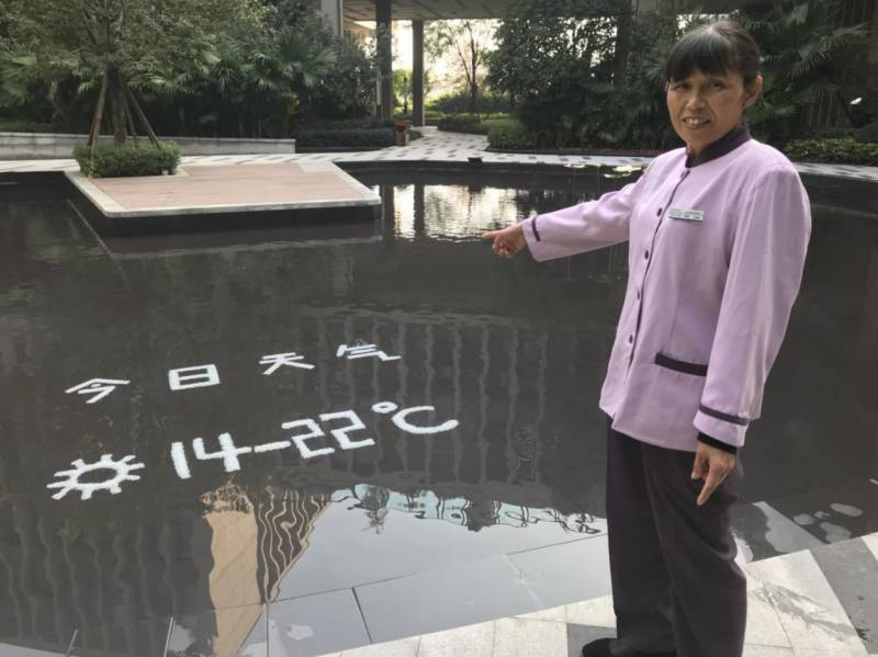 家住楼上的艾女士告诉我们,最开始发现有天气预报的时候,觉得好惊讶,心想谁弄的?超级有爱!后来我就一直观察,早上上班的时候经常看见这个阿姨在水池里摆天气预报,夏天太阳好毒嘛,一摆就是大半个小时,看起还是很心疼。现在天气冷了,希望阿姨以后戴个手套,不要冻到了。